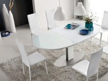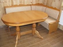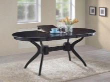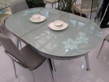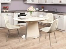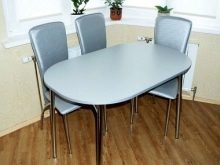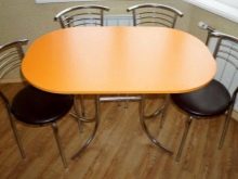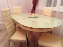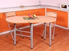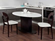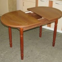 A sliding oval table is installed in kitchens with a small footage. When folded, it more likely resembles a circle, and therefore takes up much less space. The increase in surface occurs due to an additional insert, the length of which varies from 30 to 40 centimeters. As a result, if the small version accommodates a maximum of 4 people, then the large one is able to serve twice as much. The versatility of this design explains its considerable popularity.