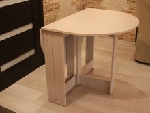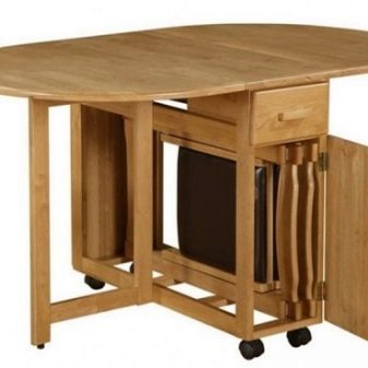 It is customary to choose a book-table for the design of small kitchens. The design looks so that when folded it resembles a compact cabinet or square table. Some even have shelves or other possibilities for storing kitchen utensils. If you raise the rounded sidewalls, you get a full oval table that accommodates a large number of guests.