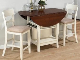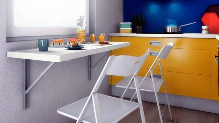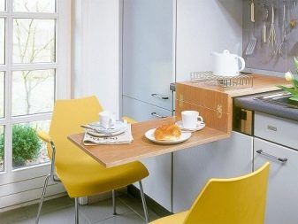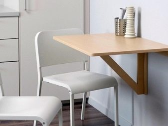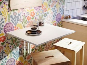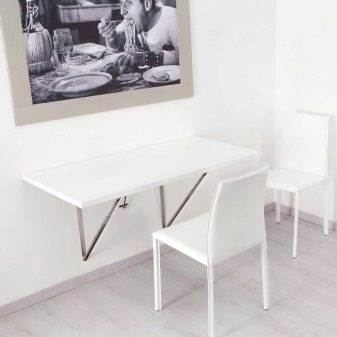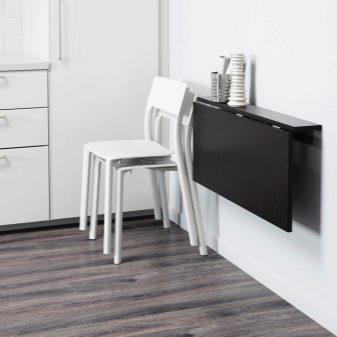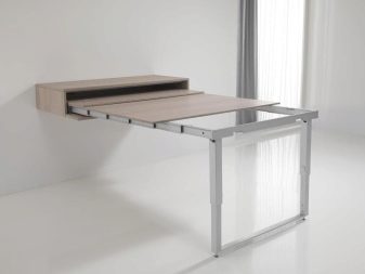 - Hinged most often it is rectangular or semicircular in shape. A device attached to a wall, in the absence of need, looks like a small shelf. If you need to establish a dining place, you just need to set the table on one leg or spacer. This simple design allows you to move freely around the kitchen while cooking. Often, such models are characterized by small dimensions.