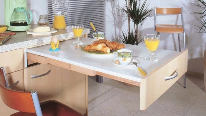 - Retractable differs in small dimensions and is not suitable for a large family.It is more suitable as a tea and coffee table or an additional countertop, as well as for a family of 2-3 people. This model is not very durable, but due to the fact that the table, built into the furniture, significantly saves space. Unnecessarily, it easily slides into a cabinet with drawers.