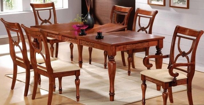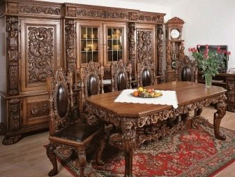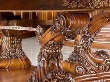 - Dining. At the carved table you can have a fine lunch. Such designs are designed for installation in the kitchen, dining room or living room. Depending on the size, they can accommodate from two to 12 people. The shape of the model is selected taking into account the requirements of the interior.