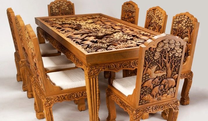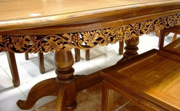 Artistic carvings can be made on products from solid wood, from wood cuts and even from plywood. The softer the material, the easier it is to work with it. For the table, wood of different densities, structures and colors is suitable, it all depends on the interior, taste and material capabilities of the customer.