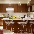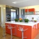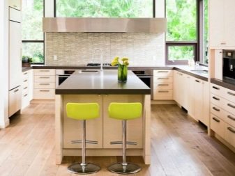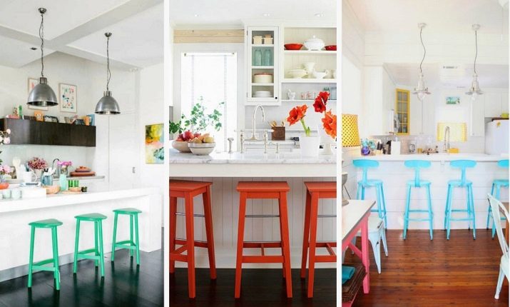 Chairs can be transparent, white or steel, made of metal, as well as wooden in all variations of brown. For plain kitchens, bright bar stools are often used, the color of which can be orange, turquoise, green, blue, etc.