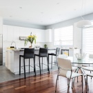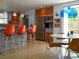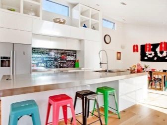 Bright and airy kitchens, in which the dining area occupies a central place in the interior, can be complemented by multi-colored and bright semi-chairs with a high leg. Such furniture will be indoors harmonious color accent, as well as a functional option for arranging the dining area.