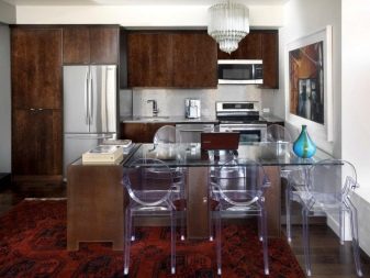 In a small kitchen, glass furniture becomes an appropriate choice. A table made of transparent material or the same chairs look not just non-standard, but also look more compact than other solutions. An alternative step is to use a minimum number of roomy furniture items as possible. But to overload the room, using a lot of modest-sized cabinets, shelves and chests of drawers, is impractical.