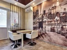 The wall in the dining area usually remains free, here you can connect your imagination and do something interesting. A great option would be photowall-paper with perspective, they will visually increase the volume of the 12-meter kitchen. Adherents of the classics try to choose plain wallpaper and plaster light shade, since they visually increase the space. Balcony walls can be glued with paper wallpaper in bright colors.