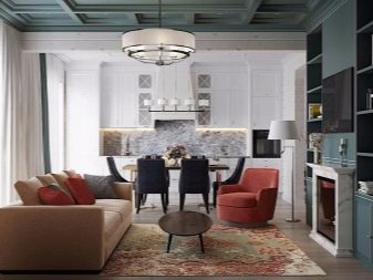 The original round coffee table with gilding is another highlight of this kitchen-living room. A note of comfort is added by a soft rug and an electric fireplace built into the column.