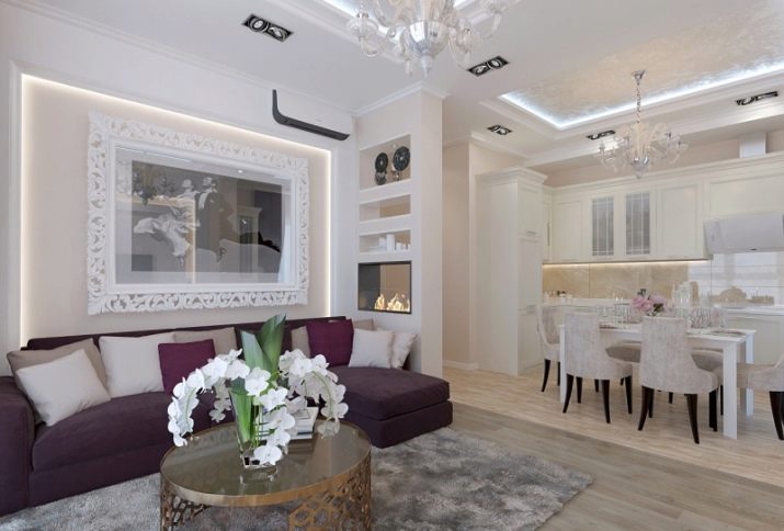 The interior is made in a classic style. Zones are separated by flooring, flow and the presence of vertical inserts on the sides. The floor in the kitchen area is covered with a practical moisture-proof laminate, while the living room has parquet. The ceiling is divided by two niches, each of which is equipped with one large light source, point elements and LED strip from the inside. The white kitchen is located in a U-shape. Nearby is a dining table with chairs. In the living area there is a purple corner sofa, which brings brightness to the interior design.