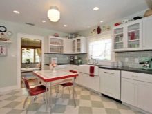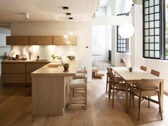 The height of the furniture should be uniform for the entire headset, the height of the dining table should be convenient for location. The width of the work tables should be sufficient for cooking. The priority is models made of wood, and in modern design they use analogues from its derivatives.