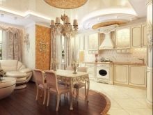 If you want to create an interior in a kitchen-studio in any of the classic solutions, it is worth emphasizing the massiveness and naturalness of furniture, the presence of carvings, stucco moldings and gilding. Design options may vary, but the basic rule will be to create an atmosphere of a palace residence in the kitchen.