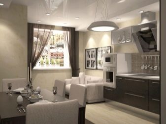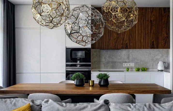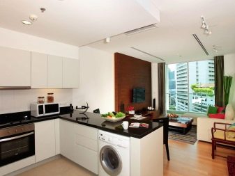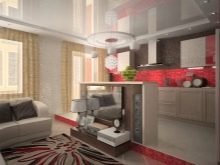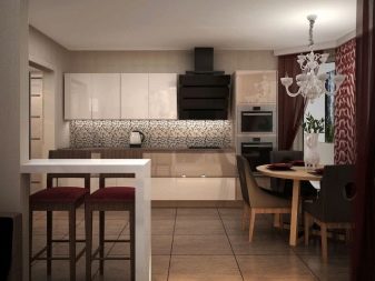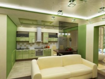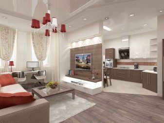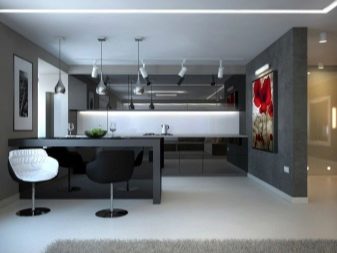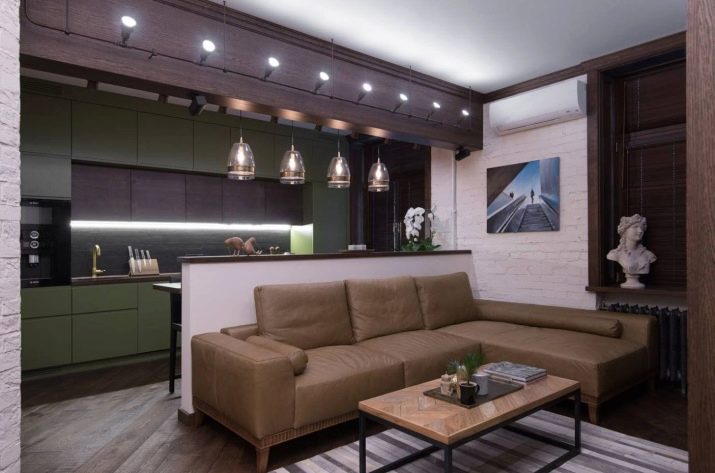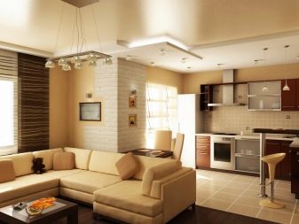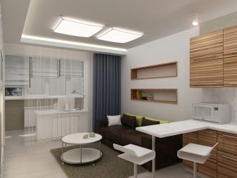 Options for the arrangement of furniture may be different. For example, if the room is wide, the kitchen can be equipped in one of the corners. At the same time, this functional area can be isolated by a two-level working table with a sink and a bar counter with its own lighting.