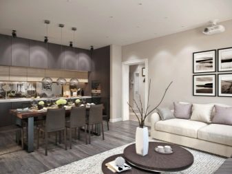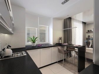 If together the combined rooms formed a standard room of a rectangular shape, the layout can be not only linear. Here you can put a corner kitchen, both with the peninsula, and with the island or with the furniture line from the floor cabinets opposite the main workspace.When a room tends to a square shape, you can equip it with a U-shaped kitchen.
