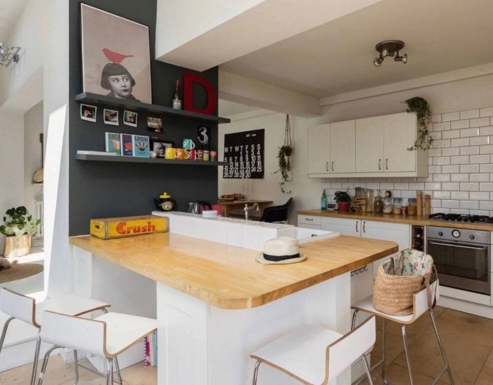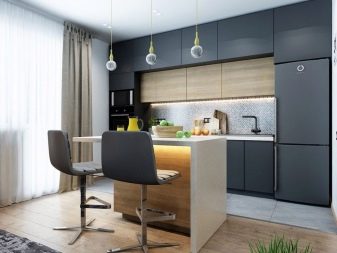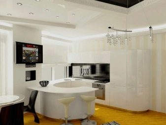Headsets are usually installed where communications take place. This allows you to reduce the cost of repair and installation of equipment. If there is space in front of the headset (about a meter), the island is set up in the form of a large desktop with a sink. If desired, you can equip the kitchen with a bar counter and supplement with a hanging shelf, as well as its own lighting. A semi-circle bar will be an excellent working area in a studio-style kitchen.