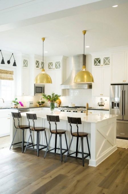 The design approach to the interior design of the kitchen-studio implies the harmony of furniture with the color scheme. The priority is a combination of light colors with bright contrasts: milk with chocolate, white with black, light gray with pistachio, white with mustard or blue. Black and white kitchen can acquire any color due to interior accessories. For example, the same greens can instantly change the emotional atmosphere of stylistics.