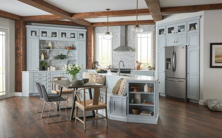 Retro and vintage, country and provence gravitate towards their priorities. In each of these styles, you need to recreate a certain atmosphere. For example, the Provencal kitchen-studio looks homely, as if you were immersed in the era of the last century. There should not be in sight of a TV or appliances.