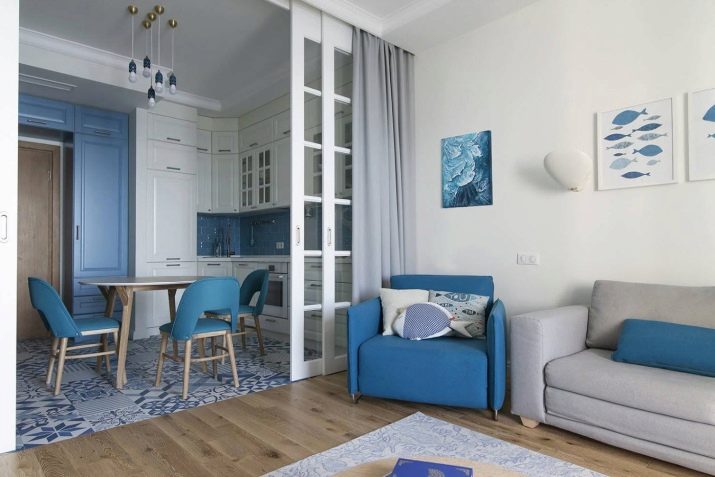 - the interior of the studio kitchen with a partition, designed in bright colors;