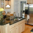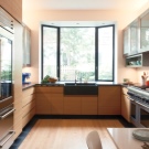 Corner kitchen units are a comfortable and fully formed workspace. Often a refrigerator already enters into them and it remains only to place everything according to the rules of the triangle, that is, on the one hand, there is space for work, and on the other, for eating. If the refrigeration unit is very bulky, then it is better to install it in one of the vertices of the working triangle, that is, at the window or at the entrance.
