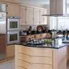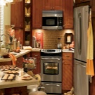 - Island layout makes it possible to bring a desktop to the center of the kitchen. However, using this solution in a small kitchen is difficult.