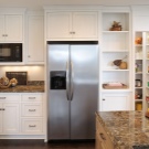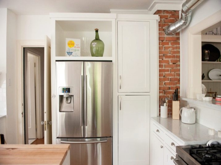 Installation in a drywall niche will be an excellent option if you want the refrigeration unit not to stand out too much from the kitchen utensils. In addition, this option is characterized by increased practicality, since less dust and direct sunlight will fall on the refrigerator. Making a niche is quite simple from an aluminum profile and a pair of sheets of drywall. At the same time, you can equip niches over the refrigerator or attach vertical cabinets to the side, if space permits.