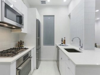 - Layout in 2 rows involves placing a sink, a cooking stove and a worktop along one wall, and a refrigeration unit and other cabinets along the other. This allows you to not violate the rule of the working triangle.