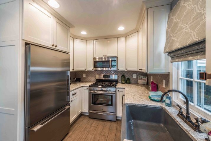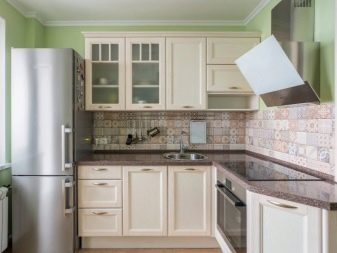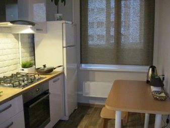 It is very convenient to place a refrigerator in the corner of a small kitchen, especially if it has a window.