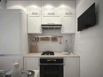 Minimalism expands the space and allows you to accommodate everything you need. Minimalism will make it possible to arrange the kitchen space of even the smallest area. For furniture facades in this case, it is better to choose plastic or MDF in the same tone without any texture. This practical design will maximize the use of every centimeter of surfaces. So, on the walls you can place hanging cabinets, household appliances, including a mini-fridge. This makes it possible to make the kitchen more spacious.