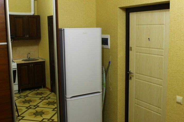 Sometimes the kitchen is so small that you have to install a refrigerator in the hallway. To do this, remove the door that shares the kitchen with another room in order to avoid unnecessary confusion with a bunch of doors. If desired, and if the layout allows, you can leave the door to the kitchen just wide open. If there is a pantry in the corridor, then it is appropriate to place the refrigerator in it.