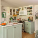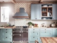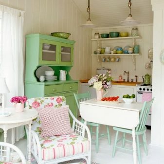- And here is a bold, not without brightness, kitchen, aesthetically close to the style of shabby chic. Buffet, open shelves, bright accents and custom geometry. It looks partly doll-like, but they fall in love with such cuisines immediately and for a long time.