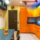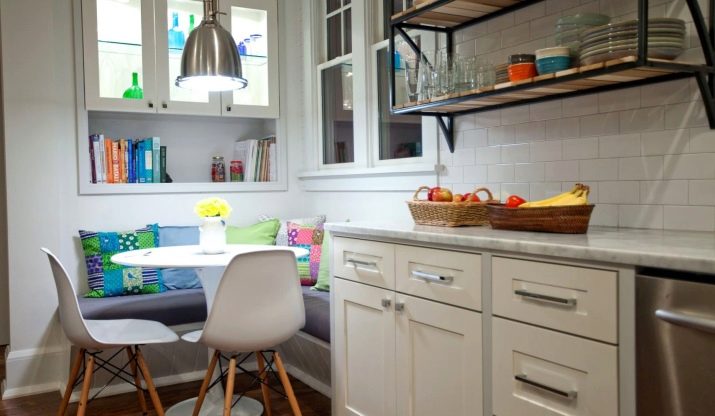 - Fans of modern style will appreciate this bright option. In this case, the dining area is designed like a cafe, and it is very convenient. Especially if you arrange gatherings you prefer in the kitchen.