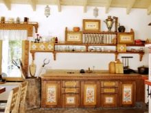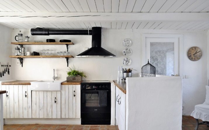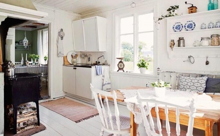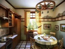 Most often in a private house they strive for a country style. But country is simply a sign of direction, which has many varieties. In a wooden spacious house, the area of which leaves such an opportunity, you can withstand the aesthetics of the chalet. It is very fashionable today, and such interiors are really stylish. But if the kitchen is small, it is better to turn to Provence, the style of a Russian cottage or to the Slavic village style.
