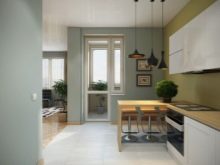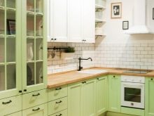 - Light green + white + wood = a perfect combination. This is how it will look in the evening hours, and the small “no complaints” kitchen will become the most comfortable place in the house.