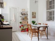 - And in this interior there are no difficulties, there is simple basic furniture, a cozy table, non-marking floor. If you do not have a door in the kitchen, such an example can be a good guide.