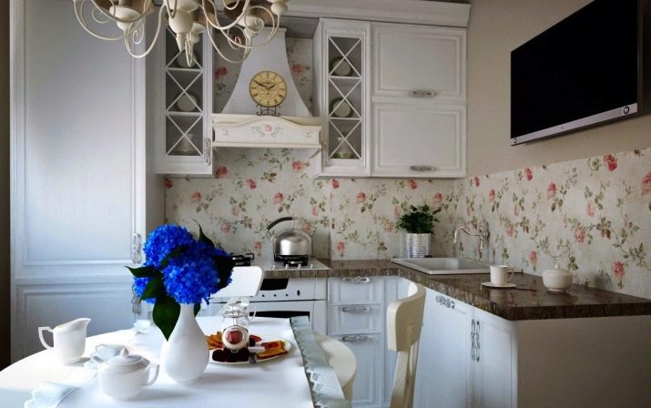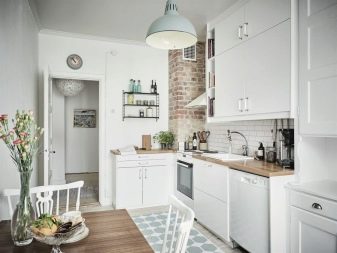 - Walls. Solid monochrome colors are preferred, and, of course, white. The option of a brick wall is possible, but if, for example, your kitchen apron looks similar, other walls should be made smooth.