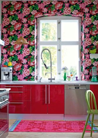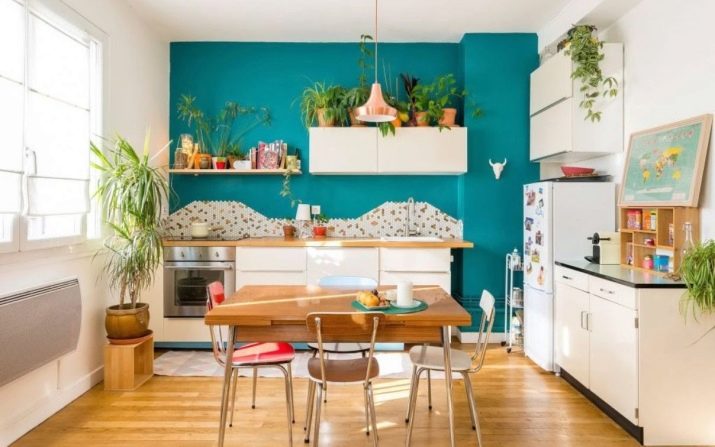 - If white interiors seem sterile and cold to you, arrange the most optimistic room in the house from the small kitchen, using very bright wallpapers, lots of wood and greenery.