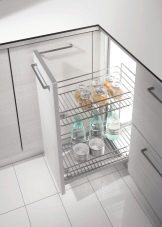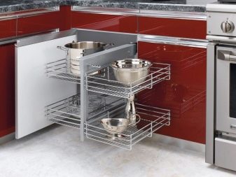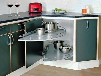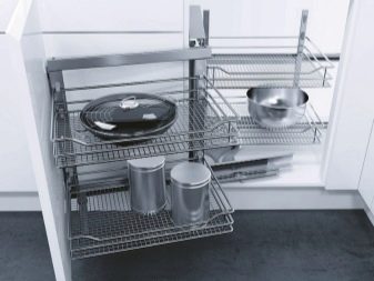 This is especially true for corner headsets. In order for the corner to be functional, a retractable mesh or a spinning carousel is placed in it. This is a very convenient way to store dishes.