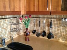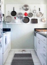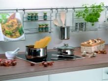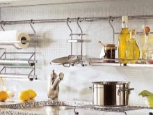 In the area of the kitchen apron, use roof rails - hinged storage systems for kitchen utensils. The set includes various hooks, glasses, shelves for storing cooks, spices and other utensils. This will significantly save space in the cabinets.