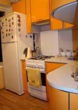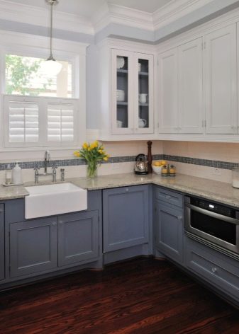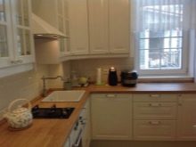 The most convenient way to place a kitchen unit. 100% consistent with the rule of the triangle. It occupies a space along two adjacent walls. The shape may be symmetrical or L-shaped. The advantages of the corner kitchen are that it allows you to ergonomically position the work area, suitable for most layouts, except for elongated and walk-in kitchens.
