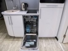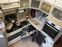 The purchase of a dishwasher will greatly facilitate life. If available, there is no need for a large sink. Thus, the area of the workplace will increase. The size range of dishwashers is huge from full-sized 60-cm units to table mini-sinks for 2-3 sets of dishes.