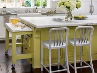 An additional storage system can serve as a sliding cabinet under the dining table. A sufficient distance for the convenience of using the table is 30 centimeters from the edge of the countertop to the front of the cabinet. To increase the working surface, you can use the tabletop for the hob or sink.