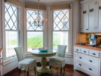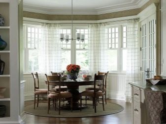 - if the bay window protrusion has the shape of a triangle, then it is most advisable to install a table in this area in the form of a circle, such a trick will distract attention from the special layout of the room.
