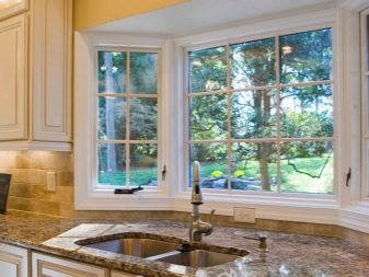 But the kitchen with a bay window ledge has its drawbacks, which, if desired, can be turned into pluses. Significant heat loss due to the presence of a large window can become one of the drawbacks of such a kitchen.