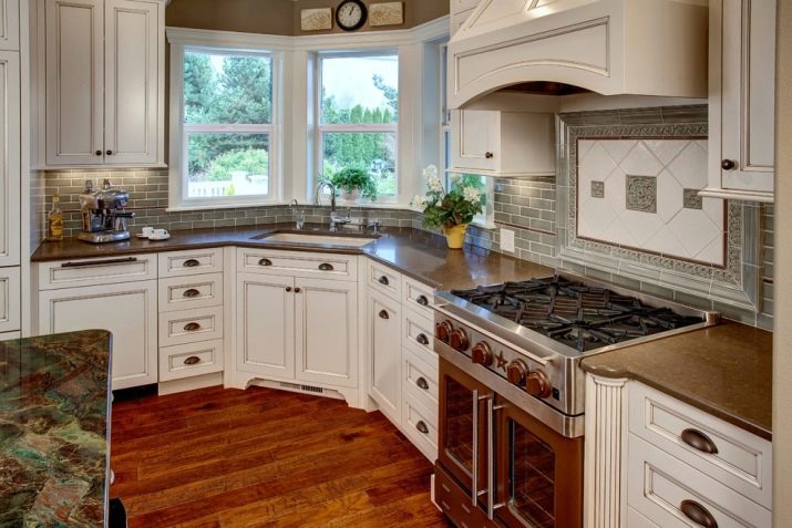 The traditional design of the kitchen with a bay window or half-window is Placing on one perimeter of the room several zones at once: working, dining, for relaxing. Most often, the working and dining areas are combined into a single space.