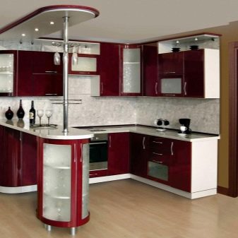 The third version of the corner kitchen is the one equipped with a breakfast bar. In a small-sized apartment, such stylish headsets sometimes look a little strange, but in a country house or apartments of a new layout, studios, "lofts" they will look appropriate, original and fresh. Especially valuable is the presence of a bar in families where long feasts are not provided, and a full dining area in the kitchen is not needed.
