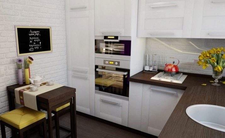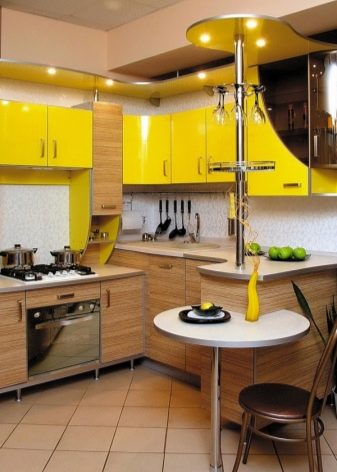 In kitchens of a small area, right angles are most often used. This, of course, significantly reduces the internal area of the headset. To simplify the extraction of various objects from cabinets, you can use different options for internal design - folding or extendable shelves and cabinets. Small apartments also need maximum use of space, so the kitchen project with a mezzanine will be relevant, where you can place rarely used items that are not susceptible to spoilage due to high temperatures and smells of the kitchen. If there is opportunity and space, it is better to resort to the equipment of the bar counter.
