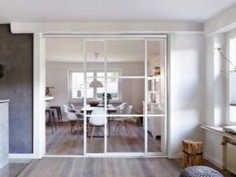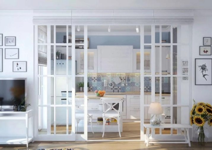 - Sliding modules. A kitchen with sliding doors that act as a divider is a common example of a shared room. Modules can be different: in the form of Japanese screens, glass partitions (frosted or transparent), wood, fabrics, plastic.