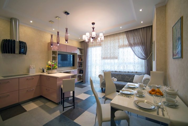 As a rule, one-room apartments with a large kitchen are equipped like this. The only room is given under the bedroom, and the living room is transferred to the kitchen space.