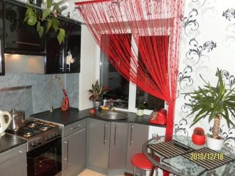 - Small-sized kitchen is suitable kiseya - curtains consisting of straight threads. Such products in a suitable color scheme look very piquant, while visually raising the ceiling and leaving the kitchen space well lit. They can also be transformed for a variety of interiors, for example, divided into 2-3 parts, fixed with grips or simply tied.