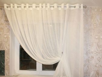 - Straight tulle mini curtains to the windowsill will look succinctly in a small kitchen.They can be attached to the cornice using wooden rings and other simple mounts.