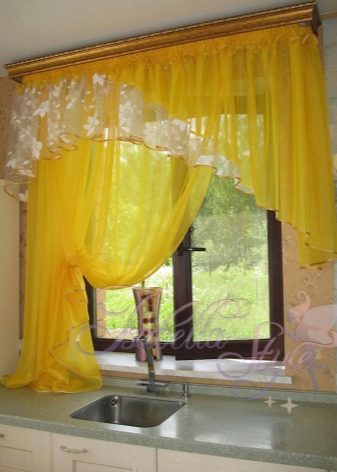 - Models with Lambrequins They look solid and beautiful, but in a small kitchen you should be careful with the choice of these curtains. Only not very voluminous lambrequins made of loose fabric are acceptable, which will harmonize in color with the rest of the design concept. In such curtains, asymmetry may be present and the length is slightly lower than the window sill.