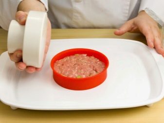 The round parts are combined into a single design and are a complete kitchen appliance that allows you to speed up the cooking process. Stuffing is laid in the lower part and one half of the cutlet is formed. The top cover allows you to form a neat filling. The third device is a hand press, with which you can crush the minced meat and form a workpiece for a hamburger or a classic cutlet.
